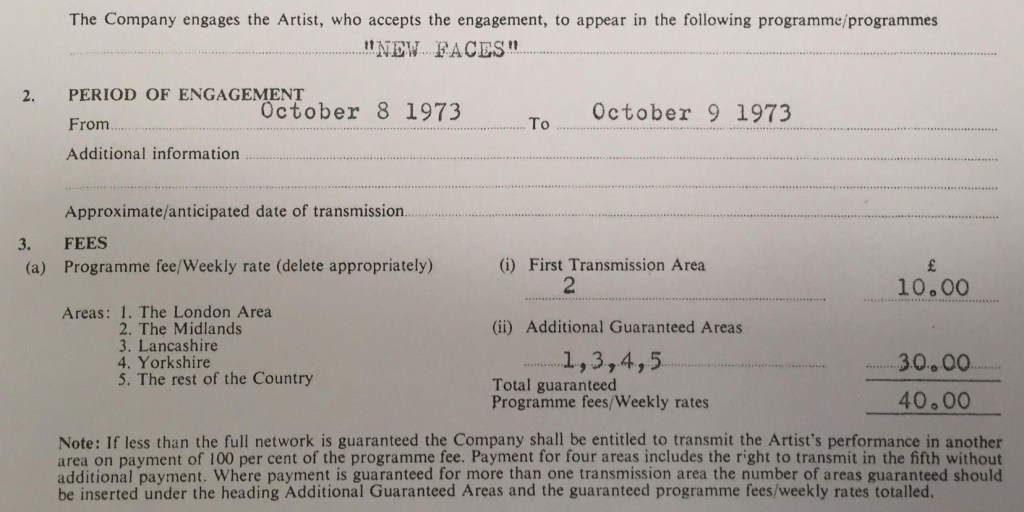 Wendy has very kindly shared details of her fee she received for appearing on the show. Interestingly, the show is listed as show four, when it was the third show broadcast. This backs up the recollection of Pete Conway, who suggested that the show he appeared on was filmed second but aired as the thirteenth and final heat of the series, meaning that the show numbers would be one out for the rest of the series.