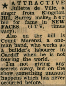 Half-Turkish, London vocalist Juliette de Ville had recently made her stage debut, appearing in the Val Arness production Way Out In Piccadilly at the West End’s Boulogne Restaurant, Gerrard Street, London. Juliette’s smouldering continental quality delivered a memorable performance as she delivered songs in French, Greek and Turkish, mixing uptempo soul with dramatic ballads with considerable ease.