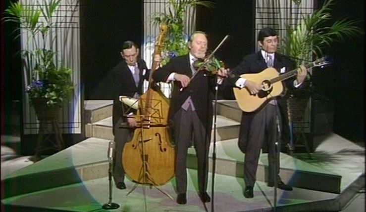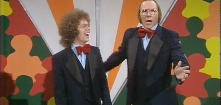 While Derek Hobson prepared to introduce the fifth act of the show he was joined by a bemused looking Mr Walling who wandered into shot behind the host of the show. Mr Carline and Mr Walling, two schoolmasters had decided to become professional entertainers following their last appearance on the show. Their performance began with Mr Walling, minus his front teeth, ‘singing’ a very out of tune version of There’s A Place For Us. He was shortly joined by the shorter, and much more hirsute, Mr Carline who ‘treated’ the audience to his ‘expert’ spoon playing, with just the one spoon. The act is probably best described as early ‘alternative’ comedy, similar to the style that Reeves and Mortimer would later be hugely successful with, devoid of actual jokes and relying purely on the madcap antics of the comedy duo to raise a laugh from the studio audience.