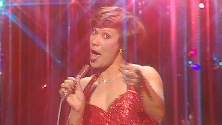 It was back to music for the third act of the series finale, which saw Exeter vocalist Simone making her fourth New Faces appearance and the second of this series. Simone chose to perform two songs, opening with the Stylistics hit Betcha By Golly, Wow, originally recorded by Connie Stevens, which she had also performed in show 5.1 and finishing with her new disco single A Little Bit Of Magic. In between the songs there was a quick set change with Simone stepping forward in front of some reflective curtains and discarding her full length jacket, which was collected from her by show host Derek Hobson.