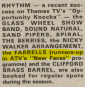 The Farrells were confirmed as New Faces runners-up in an article in The Stage in August 1974. They too appeared on the first show of series two as a viewers vote winner from their appearance on the first series.