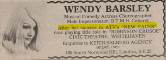 Wendy had also achieved great success in cabaret and Old Time Musical Hall as a male impersonator and was seen in this guise on ATV’s New Faces, so it seems that this grainy photo is likely to be Wendy performing on the series one show, but which one?