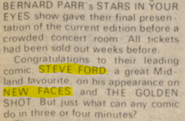 Birmingham based Irish comedian Steve Ford seems to have made a New Faces appearance before 13 December 1973. This is the date that a piece in The Stage appeared that referenced his appearance on the show and on the Golden Shot.