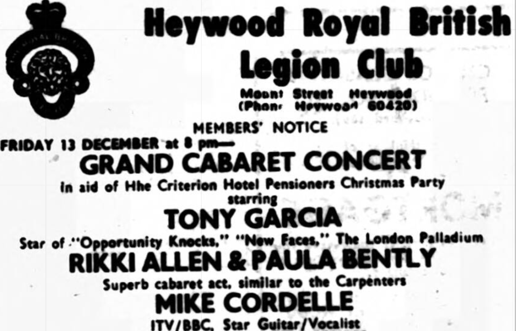 An article about a poppy appeal fund raiser show in the Heywood Advertiser, 31 Oct 1974, also mentioned that vocalist Tony Garcia had appeared on both Opportunity Knocks and New Faces.