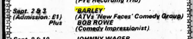 Another act where little information is available. Barley were billed as ATVs New Faces Comedy Group in an advert for their show at the Wessex Hotel, Street, Somerset in the Wells Journal on 7 August 1975.