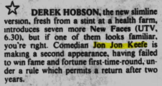 Comedian Jon Jon Keefe made his second appearance on New Faces on the second show of series six. Television listing as the confirmed acts in The Stage both mention a previous appearance for Jon Jon Keefe, who was taking advantage of a new rule of the show, announced by producer Albert Stevenson, which allowed acts from previous shows a second chance as long as it had been two years since their last appearance on the show.