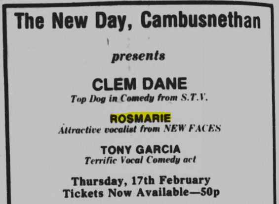 Little is known about Rosmarie, not even a surname, but according to an advert in the Wishaw Press on 18 February 1977, she had previously appreared on New Faces.